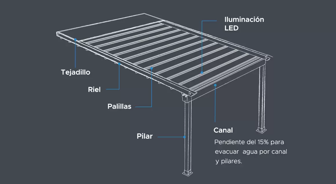 Nuestro modelo de pérgola retráctil Classic es una estructura con lona PVC blackout tensa en pendiente 15% para evacuar aguas lluvias.Cubre grandes luces y logra espacios libre y livianos.Especial para: