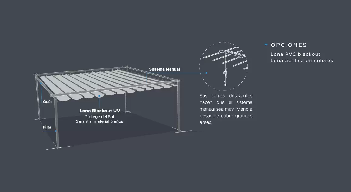 Es una estructura horizontal con sistema manual, ideal para proteger del sol grandes áreas a bajo costo.